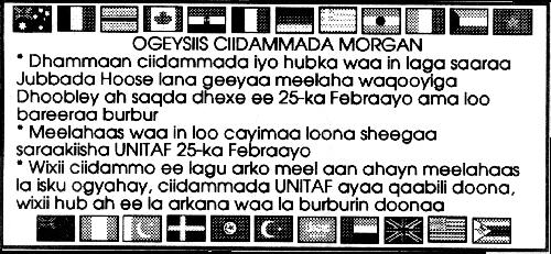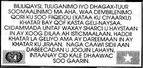 At the end of February 1993, on the first day of Ramadan, there were violent demonstrations in the area of Mogadishu controlled by Mohamed Farah Aldeed, leader of the Somali National Alliance. Following these demonstrations, children started carrying toy handguns which they occasionally pointed at UNITAF Forces. By the end of Ramadan, these toy guns were prevalent throughout the city, and there were several incidents where UNITAF forces came close to shooting children who pointed the toy guns at them. The JPOTF initiated a campaign to address the dangers of these behaviors in the RAJO newspaper over the radio and in leaflets such as those shown below which also addressed the looting problem.