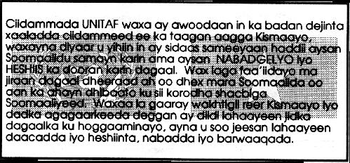 "UNITAF forces are more than able to stabilize the military situation in the Kismayo region, and are ready to do this if Somalis can not or will not choose peace and reconciliation over fighting. There is nothing to gain from further fighting among Somalis, except the continued suffering of the Somali people. The time has come for the people of Kismayo and the surrounding region to reject the path of fighting and turn seriously towards reconciliation, peace and prosperity."
