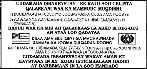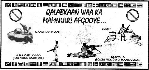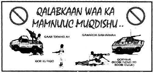 Machine guns, recoiless rifles, mortars and other crew served weapons will not be tolerated. Armored vehicles, infantry fighting vehicles, or vehicles with weapon mounts (technicals) will not be tolerated. If any of these items are seen, they are subject to immediate confiscation. Blocking Roads into Afgooye will not be tolerated. Killing or looting of relief supplies will not be tolerated. CTF Forces are authorized to use force if they are threatened or perceive to be threatened."
