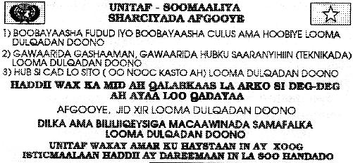 Following the establishment of the RAJO newspaper and radio program, UNITAF continued to use leaflets to announce the rules prohibiting specific categories of weapons and behavior, and informed the local communities that coalition troops were authorized to use force if they were threatened or perceived themselves to be threatened.