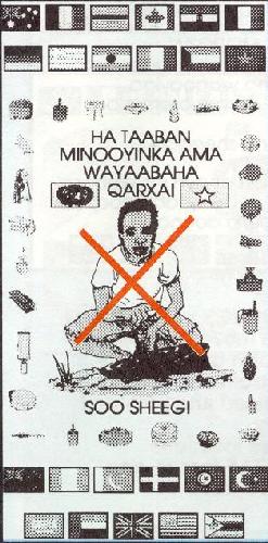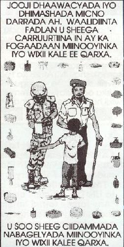 To address the mine issue, PSYOP specialists produced several different posters and published articles in the RAJO newspaper that served as public service announcements advising Somalis to be aware of mine hazards. Towards the end of the operation PSYOP also produced a coloring book detailing the first aid requirements for victims of mine related accidents; a handbill explaining how to exit a minefield safely; and posters illustrating the most common mines found in Somalia. The underlying message was the same: