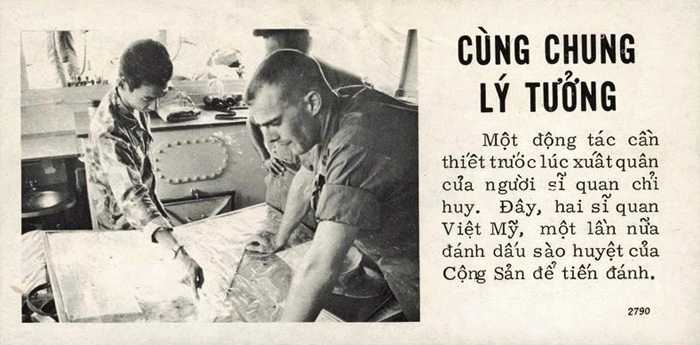 This leaflet which a depicts an American officer working with his Vietnamese counterpart. The back shows Vietnamese fighters at the front. The text is: