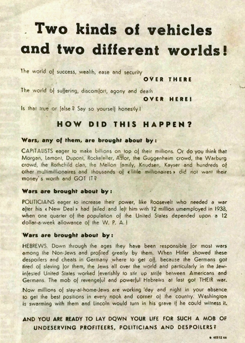 Although the above recommendation was written for US Army propagandists, it could have just as well been written for the German leaflet writers. In this article we have depicted those leaflets produced by Nazi Germany and dropped on Allied troops during World War II that featured the In-Group/Out-Group theme of anti-Semitism. It is a large field and there are over one hundred such leaflets known. We make no attempt to show them all; just a sampling of the more interesting ones.