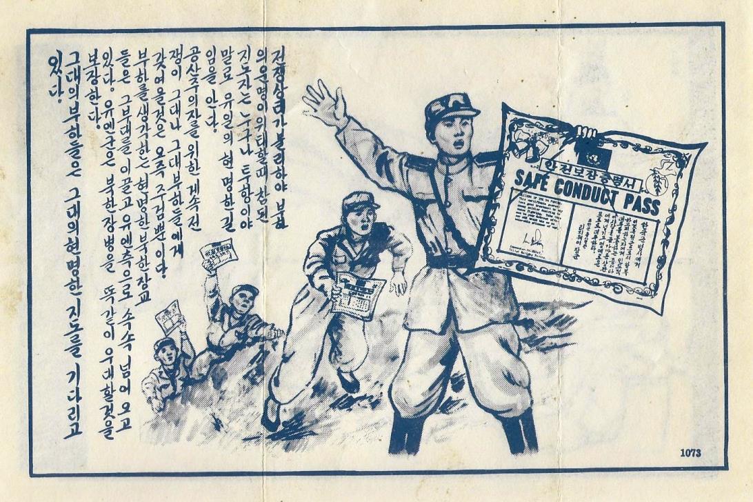 The safe conduct passes, issued in 1951, printed in Korean and English, provide instructions to UN soldiers as to the good treatment guaranteed to any soldier who ceases fighting. Another "Good Treatment" leaflet further promises warm clothing and cigarettes for all. And "you will all be given the opportunity for health-restoring recreation". It is not clear how many hearts and minds these leaflets affected, but it was an inexpensive way to make tactical profit.