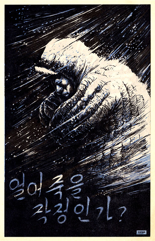 Philip Lin was a civilian employee of the 8239th Army Unit in Tokyo from 1951 to 1955. During the Korean War, the 1st Radio Broadcasting & Leaflet Group was also known as the 8239th Army Unit. Lin left behind several posters from his days as a Chief in the Graphics division of the 8239th, and later in support of public relations and propaganda for Okinawa and Korea, that his son Raymond sent to us so that they could be documented. This poster is more in the form of a public service announcement to the Korean people than anti-Communist wartime propaganda.
