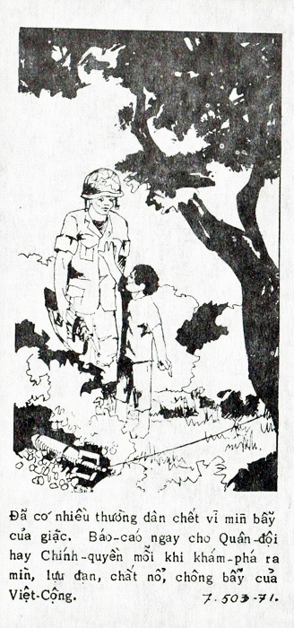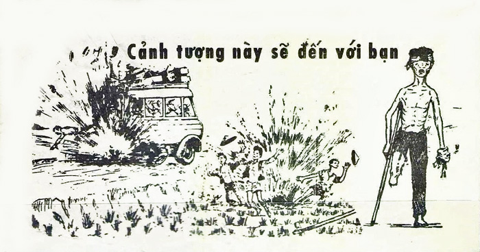 A sketch of an exploding land mind killing a Vietnamese child references a specific tragedy at Tra Bong and the warning:
