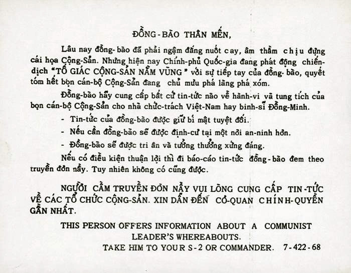 The 1st PSYOP Field Support Detachment at Da Nang and the 27th PSYWAR Detachment at Quang Ngai merged to form the 244th PSYOP Company with initial headquarters at Da Nang. The 244th PSYOP Company served combat units in I Corps and the South Vietnamese Army’s 3rd PSYWAR Battalion from an initial station in Nha Trang (in II Corps), with a detachment in Quang Ngai in I Corps. Looking through the Detachment 2 Quang Ngai Leaflet and Poster Catalog I note that besides preparing products for American forces, they printed a large number of items for the Vietnamese 2nd Division of the 12th Division Tactical Area (DTA). An Army of the Republic of Vietnam DTA comprised two or more provinces; the DTA commander was also the ARVN division commander, and the DTA was his permanent Tactical Area of Responsibility.