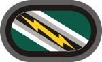A bottle green shield-shaped embroidered item with a semi-circular base 2 1/4 inches (5.72 cm) in height and 1 7/8 inches (4.76 cm) in width overall, divided diagonally from upper left to lower right by a black bend charged with a yellow lightning bolt flanked by a pair of bendlets each 1/16 inch (.16 cm) on either side silver gray and white; all within a 1/8 inch (.32 cm) black inner border and a 1/8 inch (.32 cm) smoke outer border.  The beret flash was approved on 20 December 2013.