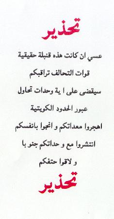 This could have been a real bomb. Coalition forces are watching you. Any units attempting to cross the Kuwaiti border will be destroyed. Abandon your equipment and live. Deploy with your unit south and you will die.