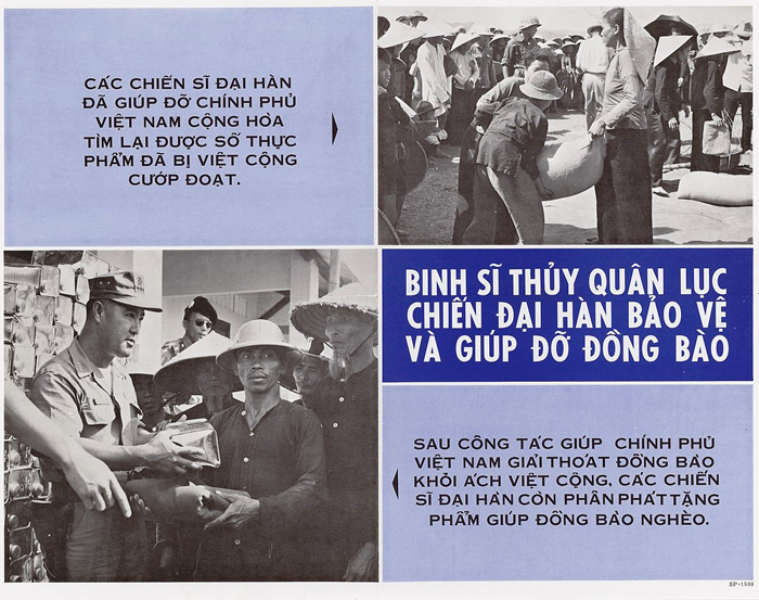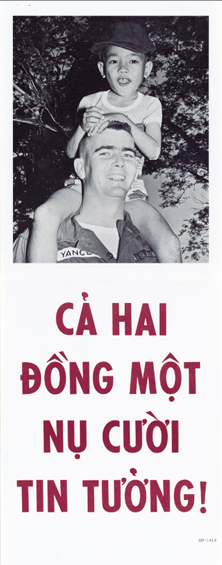The “Explain American Presence in Vietnam” grouping illustrates the activities of U.S. military personnel in Vietnam, with the purpose of assuring the rural people of the South of the friendly intentions of the United States. Several posters in this category feature South Korean forces engaged in similar activities. A small number also feature the activities in Vietnam of other allied forces from Thailand, New Zealand, the Philippines and Australia.
