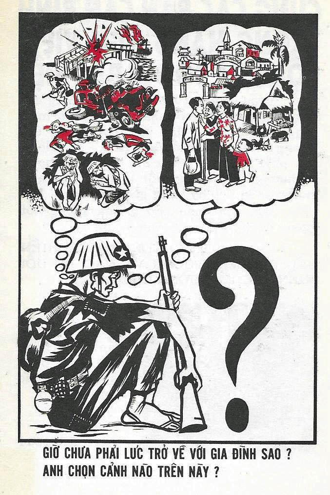 The Viet Cong sometimes placed large posters where they could be seen by American servicemen. The Viet Cong did not have aircraft and were unable to drop leaflets on Americans so their best means of disseminating propaganda was the face-to-face message, leaflets left along trails and posters wherever they could be hung. The poster above was found in February 1968 by United States Marines Lance-Corporal John Fedyszn, a forward-observer radioman from C Battery, 1st Battalion, 12th Marines, of the 3rd Marine Division. He was on a “search and destroy” patrol during Operation Dye Marker. The poster was found along the demilitarized zone (DMZ) between combat base Alpha 3 and the combat base at Con Thien. This was a free-fire zone where anyone seen in the bush was presumed to be either Viet Cong or North Vietnamese regulars. The full-color poster depicts an American soldier throwing away his M-14 rifle. Text at the left is: