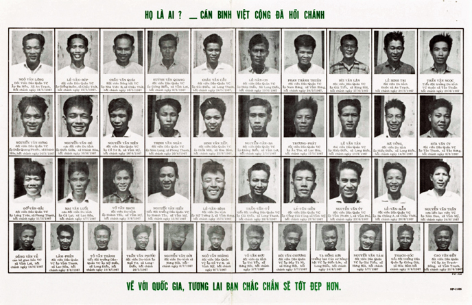 The best Chieu Hoi items are Hoi Chanh testimonials. They should have good picture, the name, and the unit of the defector. The 12 3/4 X 19 1/2-inch poster we show here meets most of those criteria. The text is: