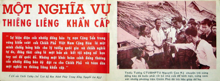 This early JUSPAO poster features Nguyen Cao Ky. He is depicted talking with North Vietnamese refugees who have been forced to temporarily leave their homes in the South. The poster is 22.5 x 8.25-inches in size. The text at left is: