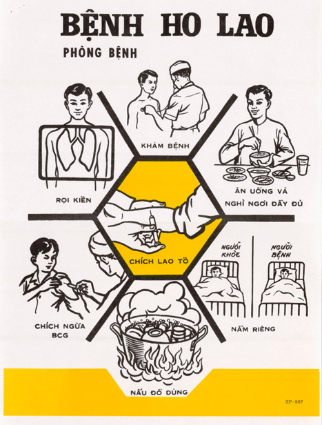 This poster has one image in the center and six more in a circle around it. Once again, the theme is tuberculosis. The descriptions are found around the poster in a clockwise direction starting at 12:
