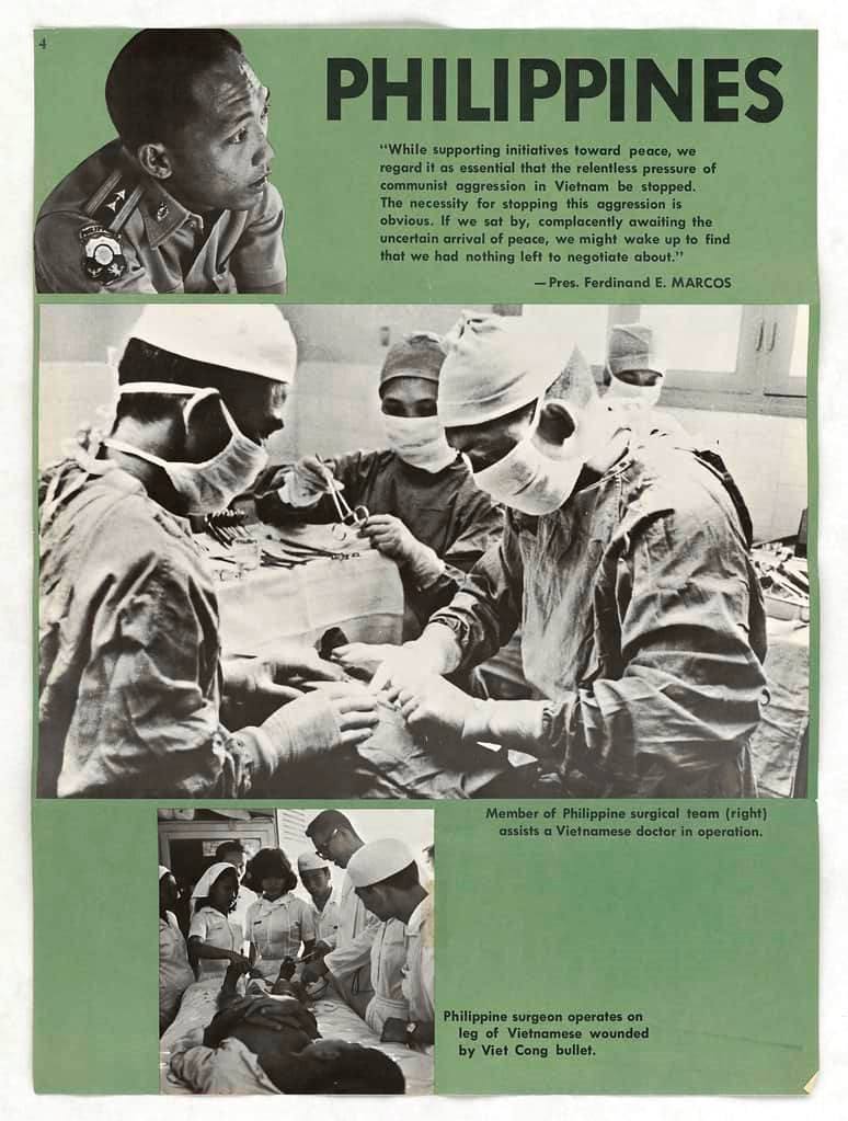 This poster was allegedly produced by the Joint U.S. Public Affairs Office to show the Philippine support for Vietnam but bears no code number. It does have a number 4 at top left so that implies this was part of a series. We know that JUSPAO printed a series of leaflets for Vietnam showing all the various nations that supported them, so this poster series could be just about the Philippines or could show several other nations that also supported the Republic of Vietnam. The U.S. National Archives says it was printed in 1973. On 29 March 1973, the Last American troops left Vietnam so if the data is correct this poster was produced very late in the war.
