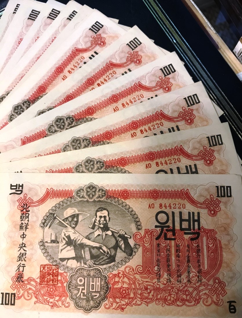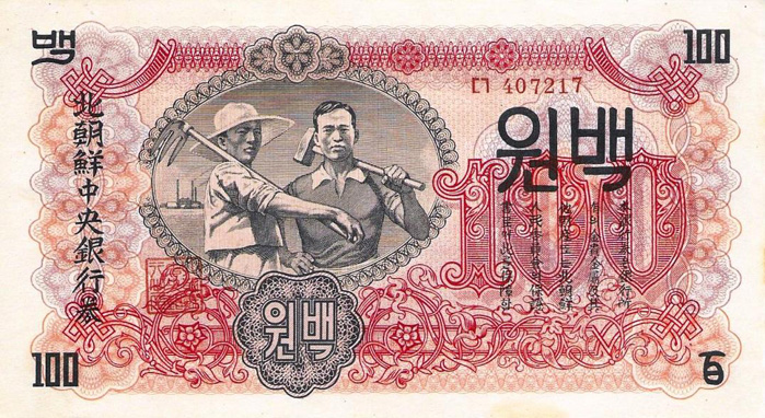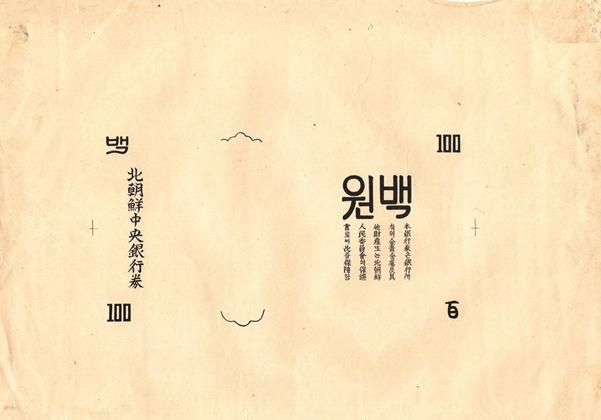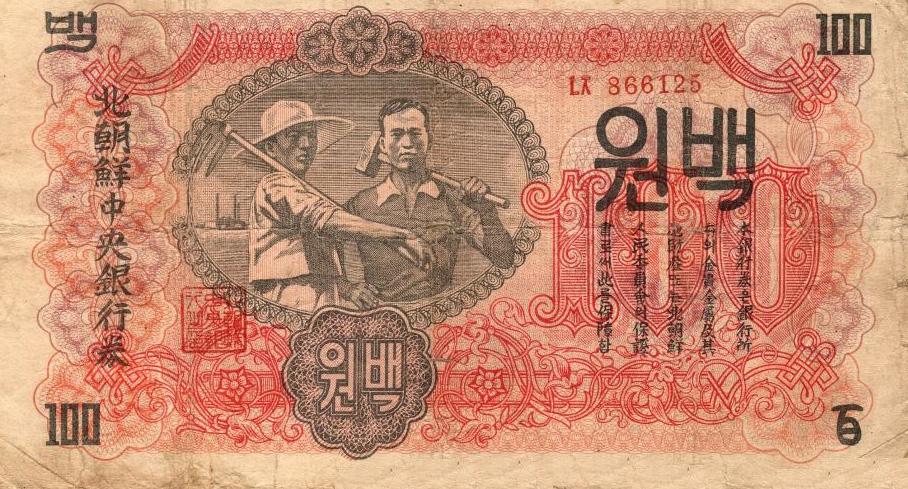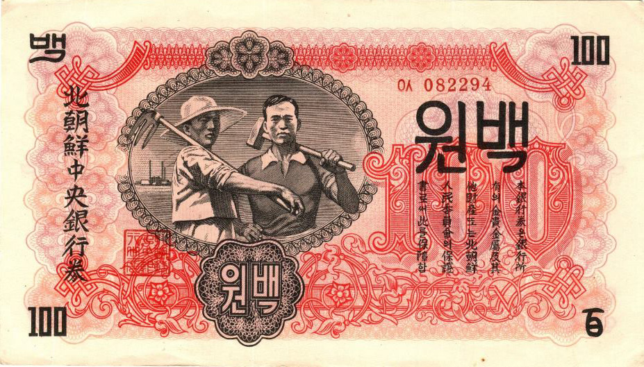 In every case, the banknote imitated is the North Korean 100 won note of 1947.