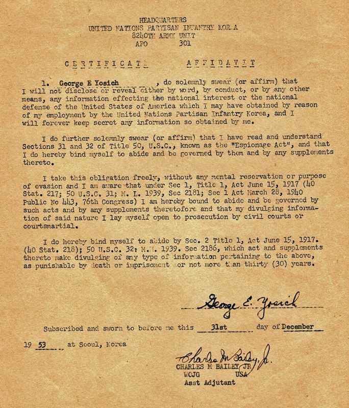 A veteran told me that while going through some boxes from a Sergeant First Class George Yosich he found some counterfeit money that was made, carried by the partisans, and distributed to family members and friends on missions to destroy the North Korean economy. He also found an interesting document was one that Yosich signed guaranteeing to keep secret his clandestine operations in the North during the Korean War.