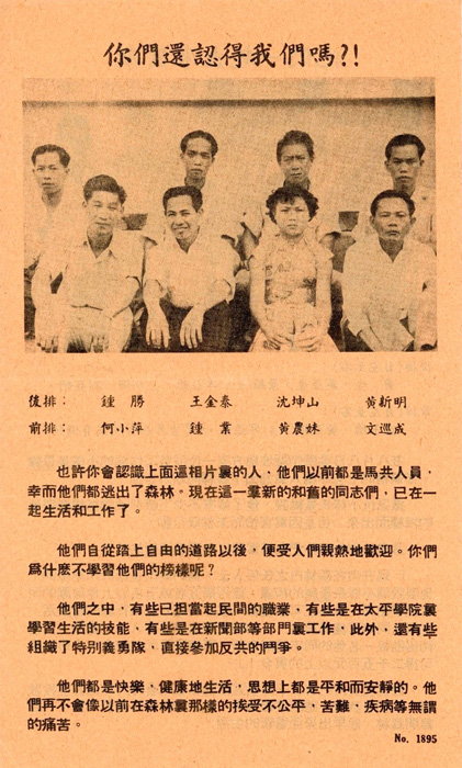 The Malayan Emergency was a communist insurgency fought over 12 years in the jungles of Malaya, for the most part, hidden from the rest of the world. The British regarded this conflict as an Emergency rather than a war, and its combatants as bandits and terrorists. Yet, a quarter of a million British troops, 33,000 police and auxiliary police, 40,000 special constables, and 250,000 home guards were mobilized to combat the 6,000 to 8,000 bandits. Through this period, a protracted propaganda campaign was waged to win over the population and to erode the support base of the Communists. A war of attrition was prosecuted, in which the enemy was rarely seen or heard, but eventually dwindled to such small numbers that the Intelligence services were able to identify 80% of them by name and face. A propaganda leaflet campaign was conducted, so intensive that for some years, it was estimated that more than 50,000 leaflets were dispersed for each insurgent remaining in the jungle. More than 500 million leaflets of almost 6,000 varieties were produced over the 12 years - practically all of which have been lost to the unforgiving tropical jungle, with the surviving pieces in archives or the hands of collectors. Through these leaflets, we have intimate records of not only the names, but the faces and circumstances of the rank and file of men and women from the jungle camps. While the history of the Emergency is well documented, there is relatively scant information about these leaflets, making this article a welcome addition to the literature.