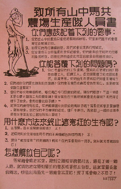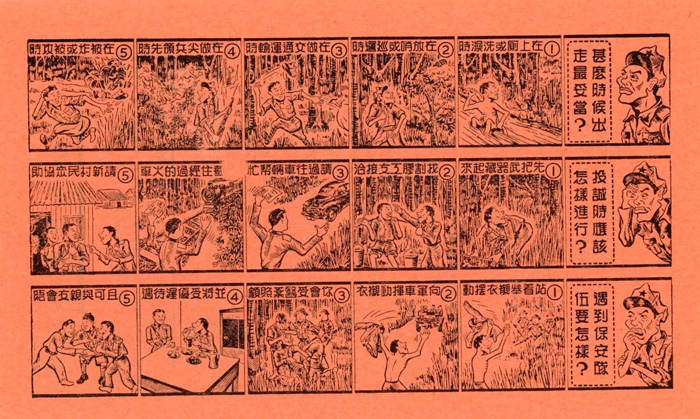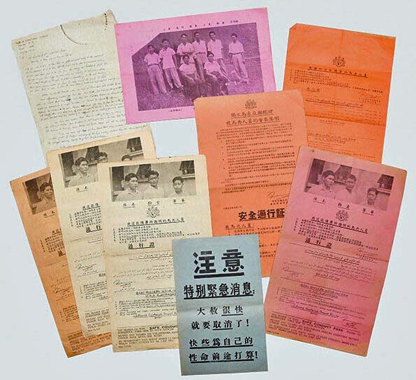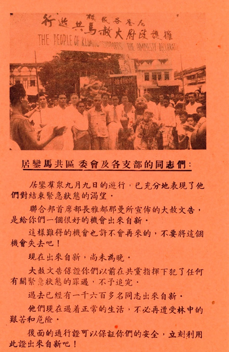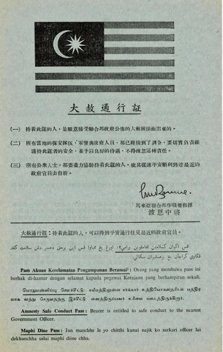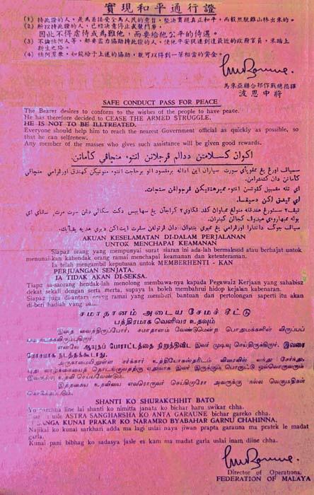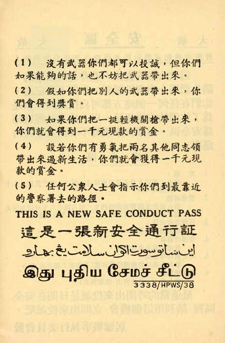 Two other passes, one in four languages and one in Chinese only, have cartoons explaining the appropriate way to surrender (British forces are shown as nothing but welcoming) and more photographs and testimonies from reformed guerillas. Other material in Chinese charts the evolution of the Malayan Emergency between 1955 and 1957. One, dated December 1955, warns in large letters that "The amnesty is almost at an end! Thinking about your future without delay!" The second, issued in the wake of the formation of the Federation of Malaya, emphasizes that the country is now independent and repeats Chin Peng's promise to lay down arms in such an eventuality.