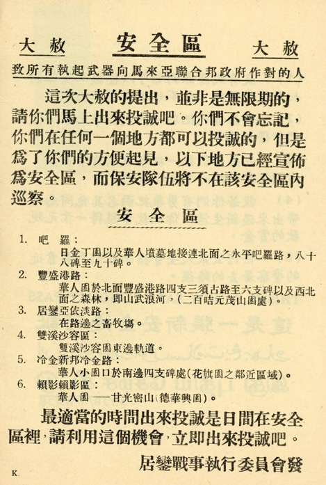 I study American Psychological Operations and do not claim to be an authority on British PSYOP in Malaya. However, PsyWar specialist Lee Richards obtained copies of a number of propaganda leaflets dropped on the Malayan guerrillas and asked me to put something together in the way of a narration. The following is my attempt to tell the story of PSYOP during the Malayan campaign. If any reader cares to add to this story with personal narrations, additional leaflets or translations, they are more than welcome to do so. Although I have used a number of different sources for this brief report, The Malayan Emergency: an Example of a Successful Counter-Insurgency Campaign, by Major Zolkopli bin Hashim of the Malaysian Army is my main reference source. I have used a number of reference papers as secondary sources, since they quite often are filled with statistics that are not found in regular studies. Among them is R. W. Komer's Rand Advanced Research Project study "The Malayan Emergency in Retrospect: Organization of a Successful Counterinsurgency Effort, and James A. Bortree's Naval Postgraduate School thesis "Information Operations during the Malayan Emergency."