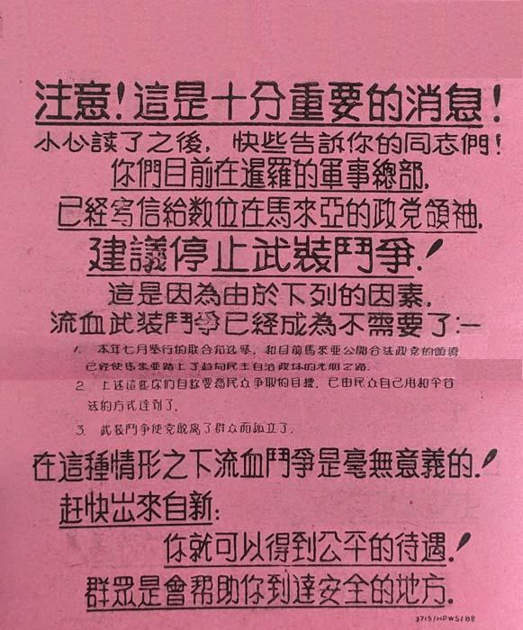 Another interesting propaganda piece is in the form of a handwritten message that has been reproduced on a mimeograph machine. It is well written and has just one spelling error. It is signed by the Publicity Department, Headquarters of the 4th Regiment, National Liberation Army of Malaya, 10 July 1951. The text says in part: