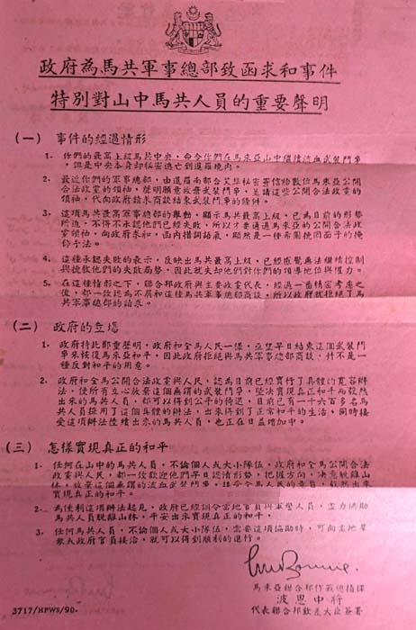 We have successfully fought the battle for five years and the attempt of the enemy to eliminate the power of the revolution has been totally shattered. The strength of the people has grown stronger day after day. This is the glory and the great victory of the Malayan people. Today, this battle has entered its sixth year. We must be even stronger and united under the Malayan Communist Party and strongly support the Liberation Army. We will continue to work to improve our lives and battle those who plan to harm us. Do not believe the enemy's deceiving propaganda. Do not destroy the reputation of Malayan Communist Party and the Liberation Army. In order to assure our eventual victory do not volunteer to join the enemy army or police force.