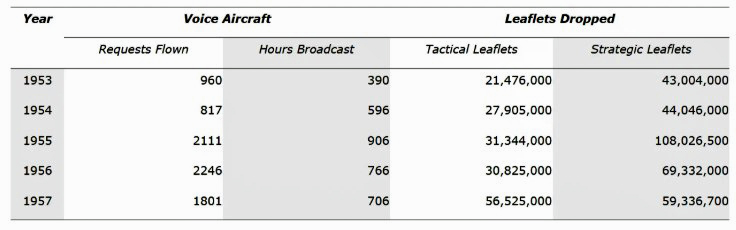 During the whole of 1953 over sixty million leaflets were dropped, more than five times as many as in the previous year. During 1954, the commitment of the air forces in the psychological warfare campaign continued at a high level. Valettas of the Far East Transport Wing from their base at Kuala Lumpur and Austers of No 656 Squadron flew 146 strategic and 182 tactical leaflet dropping missions during the year, during which they dropped over sixty million leaflets. The year 1955 witnessed the peak of activity in the psychological warfare campaign and the contribution made by the air forces doubled in comparison with the previous year with the delivery of 141 million leaflets on 365 leaflet dropping sorties and of 906 hours of broadcasting from the air. Just over 100 million leaflets were dropped in 1956.
