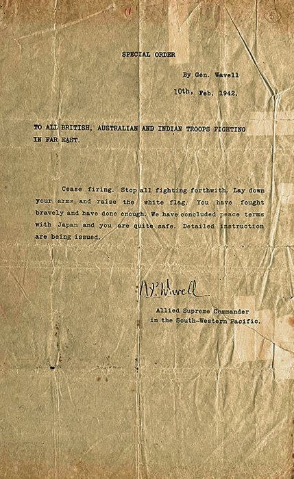 Photo: Benjamin Seet"Cease firing. Stop all firing forthwith. Lay down your arms and raise the white flag." This surrender note, circa February 1945 and signed off by General Archibald Wavell of the Allied Forces, was in fact not penned by him. It was a forgery by the Japanese army invading Malaya, meant to mislead the British forces into surrendering. This rare copy of black propaganda – a genre of propaganda that aims to deceive through false attribution – used to be in the hands of a private collector. But it will now be part of Singapore’s national archives.