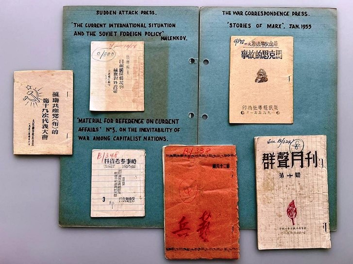 A series of Malayan Communist Party publications, printed for use by communists in jungle camps, and kept small so they could be easily hidden and carried around.