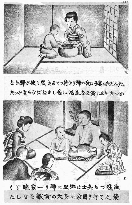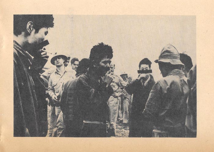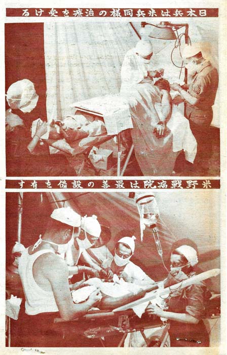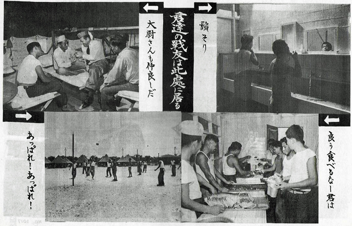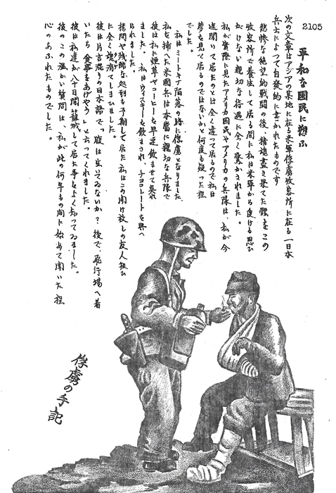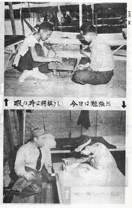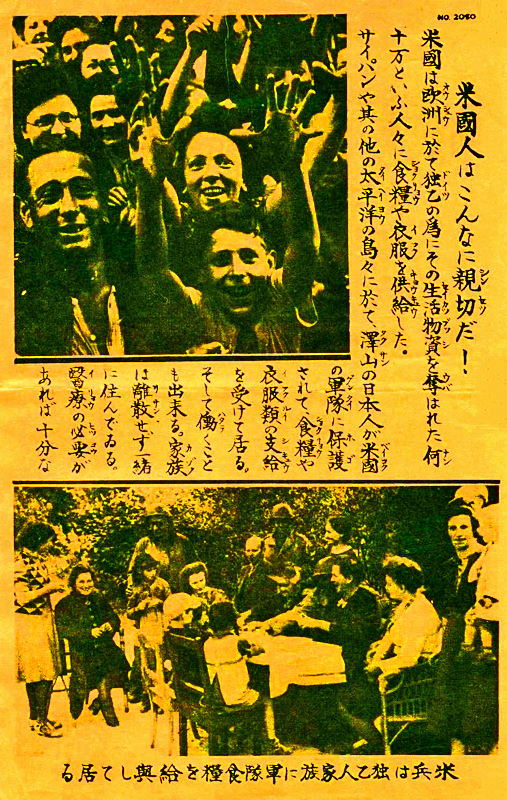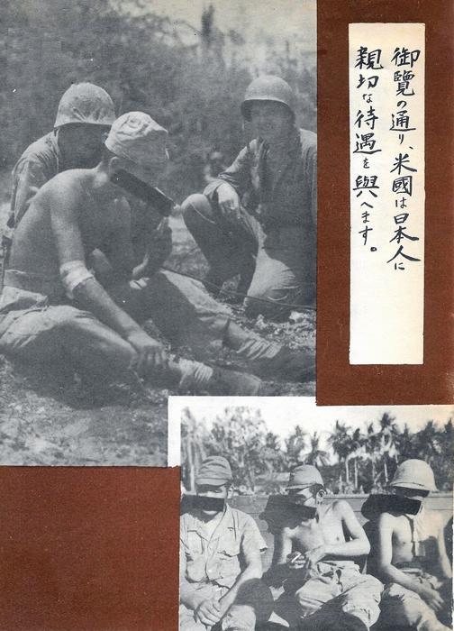 Another leaflet on the theme of hopelessness. Its purpose is to shatter Japanese morale and induce surrender. It depicts two images of Japanese prisoners of war who are being treated well by the Americans. Attention is called to the miserable position in which the Japanese soldier finds himself, and a promise of kind treatment is made to those who surrender. The text on the front is: