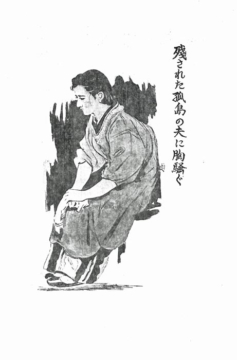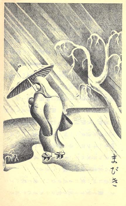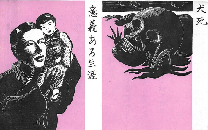 The kiri leaf falls. Its fall is the ill omen of the inevitable downfall of militarism. With the fall of one kiri leaf come sadness and bad luck.