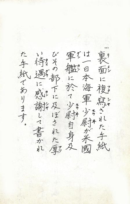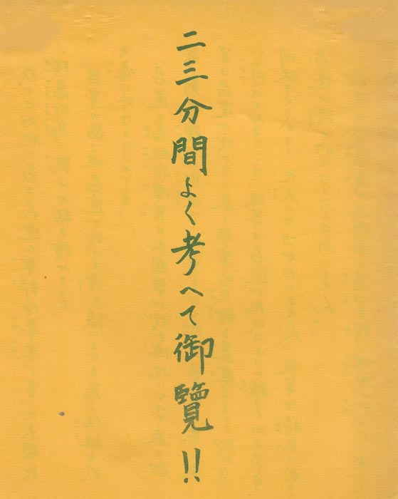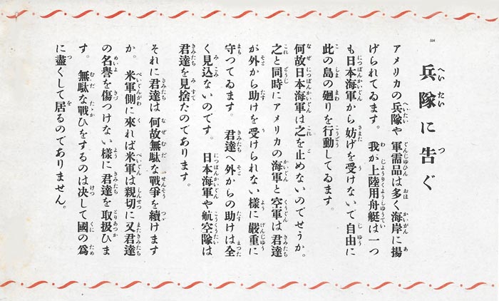We do not show the kiri leaflet in this article because it was not printed on Saipan and used against the Japanese mainland and in Pacific battles. It was used in the Aleutian Islands. In June 1942, Japanese forces occupied the islands of Attu, Agattu, and Kiska. Attu was recaptured by the U.S. Army Seventh Infantry Division in May 1943. 60,000 of the kiri leaflets were dropped over Attu and Kiska before troops landed on Attu. Text on the front of the leaflet is: