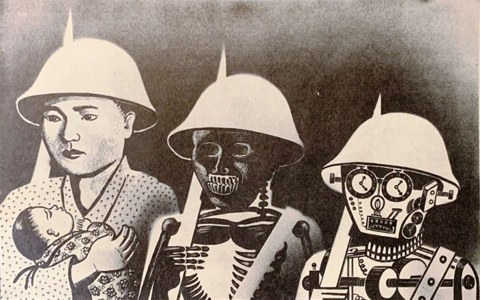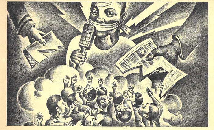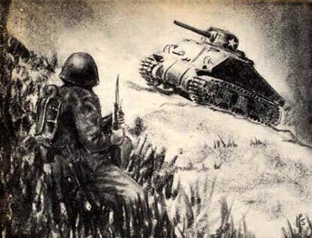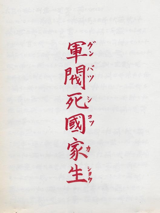 Last week Japanese civilians were told that they must help defend the Japanese home islands when the Americans invade and were warned they must “not allow themselves to be taken prisoner or die dishonorable deaths.” If obeyed, the order to commit suicide rather than surrender would produce a terrifying holocaust. The Americans are trying to crack the core of this credo by deluging Japan with propaganda leaflets and broadcasts. Recognizing the fanatical devotion of the average Japanese to the emperor, the propaganda tries to drive a wedge between the civilians and the military caste, on “Gumbatsu.” Leaflets showing that the Gumbatsu is chiefly responsible for the present sad state of the Japanese nation are lessons in Japanese history. They point out how members of the Gumbatsu, like Tojo sneaked into governmental control, usurped the foreign policy and finally pushed the country and the Emperor into a stupid, bloody and hopeless war.