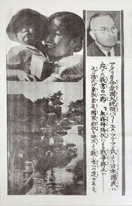 For the Japanese, the most disheartening issue of the Mariana News was probably number 2523. This issue featured a large photograph of the Hiroshima atomic bomb explosion and a series of stories of Japanese defeats in every area. For instance, it explains that Japan's militarists have rejected Allied peace terms and as a result, President Harry S. Truman dropped the atomic bomb on Hiroshima. Truman says that he only dropped the bomb after Japan rejected the Potsdam peace terms. Russia has declared war on Japan. Molotov states that since Japan has rejected the Potsdam terms, peace overtures are meaningless. The island of Kweilin has been taken by the Americans. The Japanese have been routed in Borneo. Japanese casualties are mounting in the South Pacific front and the Japanese have suffered tremendous losses in Burma. It is no wonder that after reading such news the Japanese were ready to surrender.