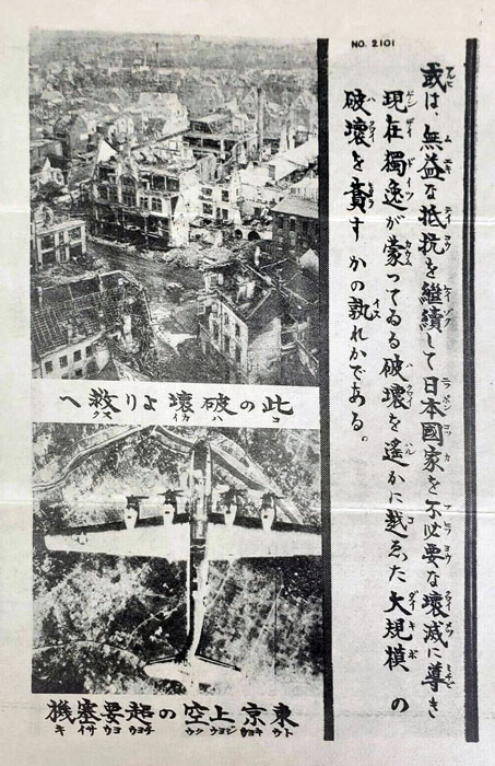 As a result, civilians followed our instructions in some cases so well that virtually the entire civilian population came into our hands. He also says that the U.S. took more than 9,000 prisoners. Now at last we were ready for the final full-scale assault on the Japanese homeland itself, to see whether we could put a crack in the alleged unbreakable will of the Japanese people to resist to the end. The Japanese government tried to ignore the leaflets at first, but as they continued to shower down upon Japanese cities their influence was such that counter steps had to be taken. Yet the very taking of counter steps was an acknowledgement of the importance of the leaflets. The leaflets pointed to the lies of the militarists and capitalized on a loss of faith in Japan’s military power were among the most effective. Those advising workers to stay away from war factories and to evacuate cities also struck home, as did those capitalizing on the fear of air raids.