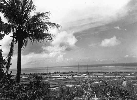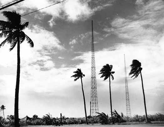 The area assigned for the OWI transmitter site, on the West Highway, in about one quarter mile square, and adjoins the beach. The receiving station is located on the opposite side of the highway, immediately at the north end of the transmitter property. The receiving antenna system extends over an area now also being used as open storage…Erection of the four 250-feet Blaw-Knox towers was by the 152nd Engineer Battalion. They were completed on 24 January 1945. A decision had been made to locate a standard wave radio transmitter as close as possible to Japan. The special antenna of the 50 kilowatt Doherty, Western Electric transmitter aimed an estimated 230,000 watt signal to Japan… B-29s bombing Japan indicated the OWI transmissions were strong over the main islands.