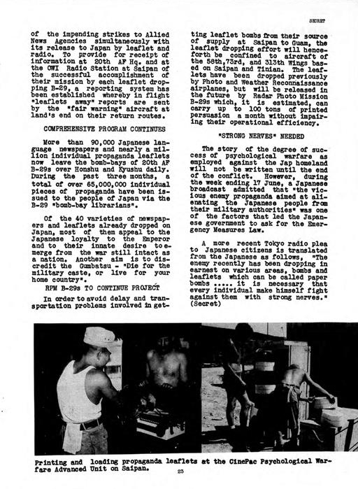 I firmly believe that the propaganda leaflets which were used in this war filled a major role hitherto unparalleled in world history and that they fulfilled the heavy responsibility of psychological warfare in the most effective manner…I believe that in modern warfare, military operations can be most effective when a war of strategy which combines the two major elements of scientific warfare and psychological warfare is applied…This new tactic is a most appropriate one to apply against a militaristic nation…I believe that the use of propaganda leaflets in this war facilitated military operations and made them more effective.