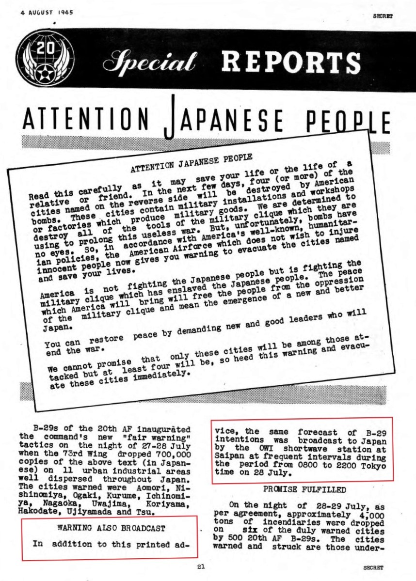 Now of course it could be genuine. There is always that possibility but it is about 5%. Also, the leaflet does not look right. it is not designed in the general format the US used. And finally, why tell them this was the last bombing. What purpose does that serve? The leaflet doesn’t ask them to do anything, to head for safety, to tell their leaders to ask for peace. If that was real, it would be quite famous, but we already know what the last leaflets looked like, very long and all official jargon like 2118, the Imperial Rescript, telling them the war was over.