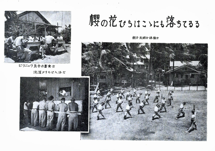 The photograph in the center depicts a group of Japanese prisoners marching into a prison camp with the text: