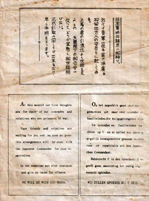 The British Southeast Asia Command prepared a general leaflet for all the Allied prisoners of war in English, Dutch and Urdu. The translation is: