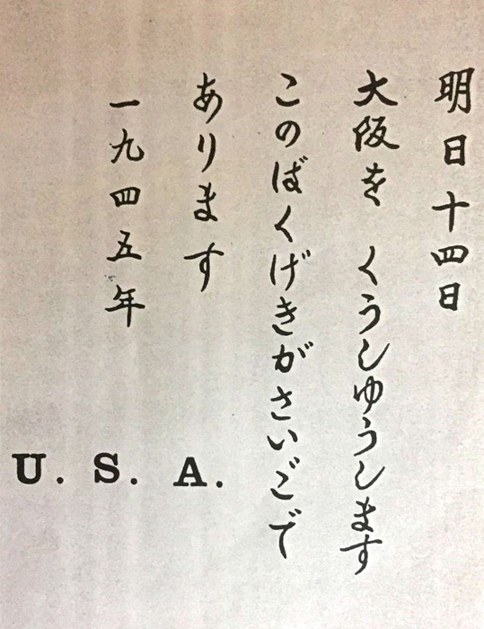 Do you know about the leaflet in the attached image? The translation is, "Tomorrow, the 14th, we will carry out a bombing raid on Osaka. This will be the last bombing. U.S.A." Apparently, this leaflet was dropped in Osaka on August 13, 1945. This leaflet was published in a Japanese book, the title of which translates to, "August 14th in Osaka Hohei Kosho, history and the air raid." The only information about this leaflet I can find is a photo and an eyewitness account written in a book. The leaflet's code number is unknown. There's no solid evidence that this leaflet existed. I'd like to prove whether this leaflet existed or not.