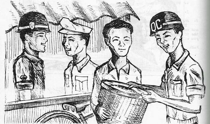 To properly perform their duties, the police inspect cars, buses, boats, barges, and other conveyances to prevent smuggling and infiltration. They check luggage, parcels, baskets, and boxes for illicit goods. They also conduct house to house searches in order to ferret out enemy agents, hoodlums, and draft dodgers