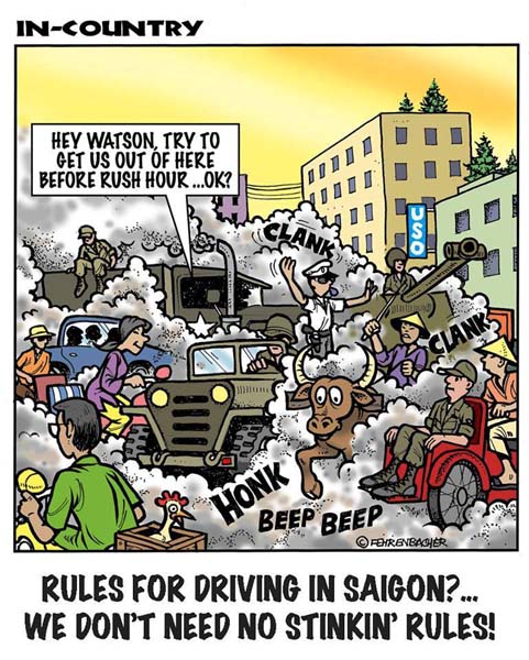 This IN-COUNTRY cartoon by Fehrenbacher depicts a Vietnamese policeman trying to direct traffic while surrounded by jeeps, tanks and even water buffalo. The real danger included Viet Cong terrorists, bomb throwers, and probably a good deal of drunken Americans, Vietnamese black marketeers, pimps, and local criminals. Life as a policeman is never easy, and in Vietnam during the war it must have been far worse. This cartoonist has the rare ability to catch scenes from the Vietnam war that are highly prized by veterans.
