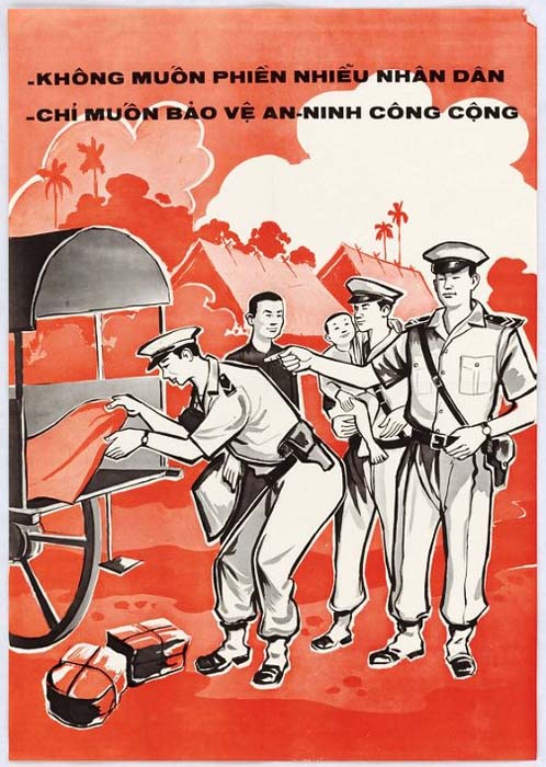 Through their resource control teams the National Police protect the resources of the country and pervert them from being diverted into the hands of the enemy. More and more, the Viet Cong are being deprived of manpower, weapons, ammunition, and other essentials of war. Their combat capabilities have been considerably weakened, and their morale is being sapped. To properly perform their duties the Police inspect cars, buses, boats, and other conveyances to prevent smuggling and infiltration. They check luggage, parcels, baskets, and boxes for illicit goods. They also conduct house-to-house searches in order to ferret out Viet Cong agents, hoodlums, and draft dodgers. If you encounter minor difficulties because of inspections and searches please remember that the Police are protecting you and serving the cause of the Government of Vietnam. Your cooperation is needed.