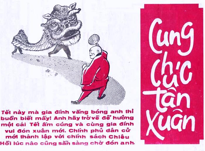 Your family and compatriots are extending their love to embrace their wayward sons back. The State will open its arms to warmly welcome you and treat you with dignity. You'll have adequate food and clothing. A new life awaits you. During this Tet season, promptly wake up and come back to the National Government, to the big family of our Nation, to fulfill your duty of a patriotic son.