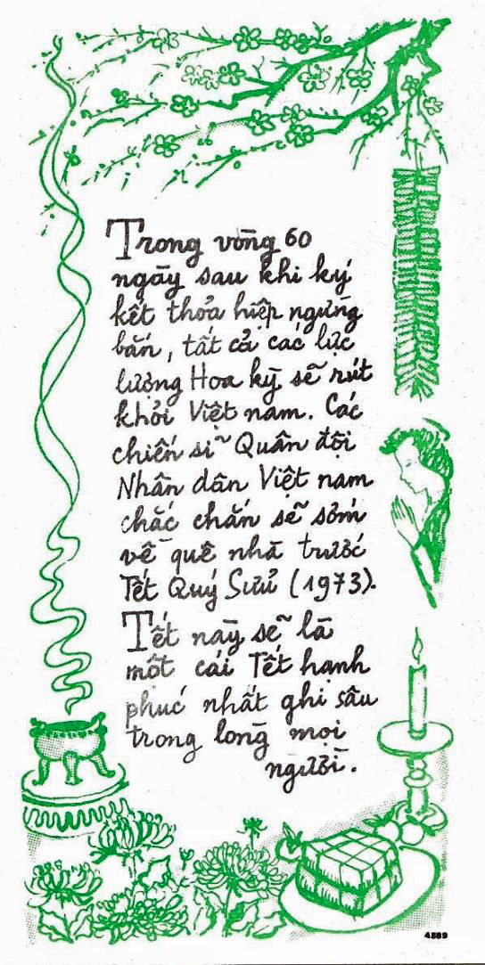 You should be with your loved ones in time to enjoy spring. The ceasefire agreement has been signed and all American and Korean forces will be withdrawn from Vietnam. The soldiers of North Vietnam can return home.