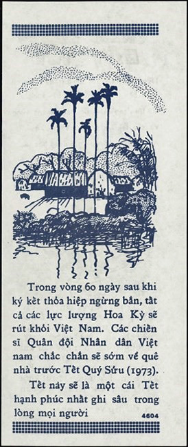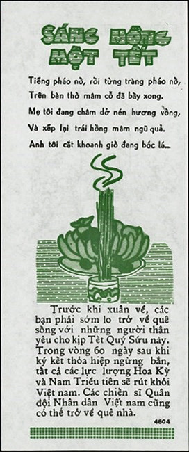 This is one of the last Tet leaflets coming from the 7th PSYOP Group and sent to JUSPAO for use in Vietnam. It was developed on 20 January 1973. The peace treaty had been signed so besides using Tet as a theme it also tells the North Vietnamese troops that they will be going home. Of course, the North Vietnamese troops had no intention of going home and in the not-too-distant future would invade and conquer South Vietnam. The front has a short poem and a Tet message: