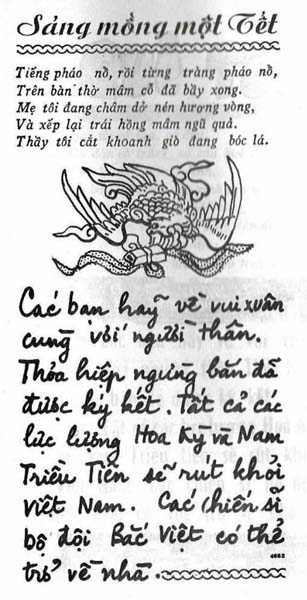 This leaflet was disseminated by the Viet Cong in 1967 and demanded that the Americans and South Vietnamese respect the Tet truce. I add it only because of the irony that one year later the Viet Cong ignored their own 1968 Tet Truce and attacked all the major cities in South Vietnam. The idea was good, and they even got into the American embassy, but the South Vietnamese people did not rise up in support of the Viet Cong and the result was that the Viet Cong for a brief time was wiped out and no longer a military force. This led directly to greater numbers of North Vietnamese troops being sent south to take up the slack.
