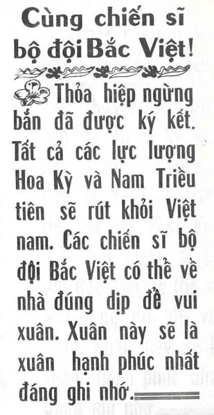 The ceasefire agreement has been signed and all American and Korean forces will be withdrawn from Vietnam. The soldiers of North Vietnam can return home to enjoy springtime. This will be the happiest spring in memory.