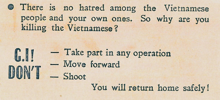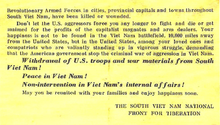 This is a Vietnamese flyer that was used in the villages & jungles where U.S. forces were known to operate…This flyer is from the Brad Peterson collection. Peterson is the author of the book "Paper Tigers", considered the bible of VC/NVA propaganda used during the war.